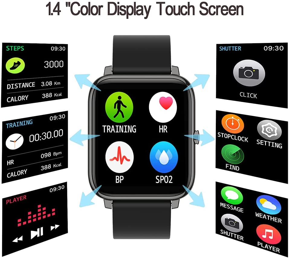 【overtake your expectations】our 1.4 inch color touch screen make it easy to operate and easily check detailed data reports. there is 4 stylish clock faces for you to choose from, different styles match your different moods. more practical tools such as alarm clocks, stopwatch, timer, camera control, music controller, sedentary reminder, adjustable brightness,find phone. this watch can be a very good gift choice to make people live more healthy, more active and more convenient.