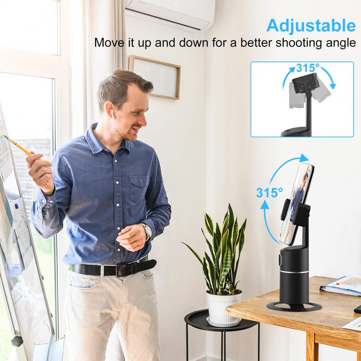 Cover Every Angle:360° rotation angle, adjustable clip. 104° field of view angle of lens and 42° rotation speed per second ensure that the tracking tripod can track your movement, wherever you go, you’re the focus all the time